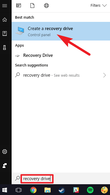 ① Connect the USB drive to the computer. Type “create a recovery drive” into the search box in the lower-left corner of your Windows computer, and click “create a recovery drive” in the search results.