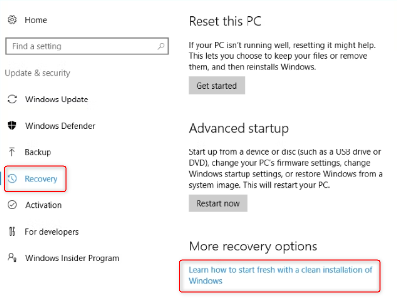 ① Open Windows Settings, then click Update and Security > Recovery. Click the text link Learn how to start fresh with a clean installation of Windows.