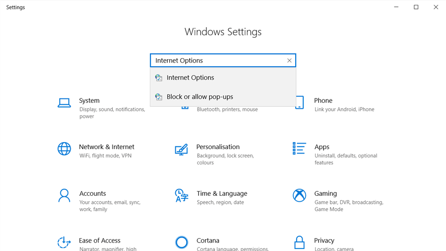 Press the Windows and I keys at the same time. Then please type “Internet Options”. (Related item could be found in Control Panels as well.)