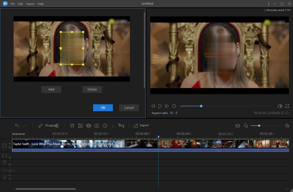A mosaic editing box will appear on the video screen. Drag the mouse on the time axis to the desired video frame, then adjust the mosaic editing box position. After confirming, click Add and then OK. Once editing is complete, click Export in the top menu bar, select the desired video format, and the mosaic-added video will be saved in the preset location.