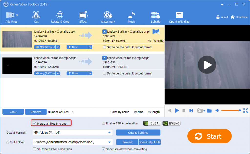 Step 5: Return to the home page after editing, check “Merge all files into one” to unify your videos’ output parameters, and click Start in the lower right corner to begin production.