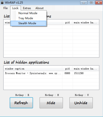 2. Return to main interface of WinRAP. Choose “Stealth Mode” in “Lock”. Then WinRAP will be hidden.