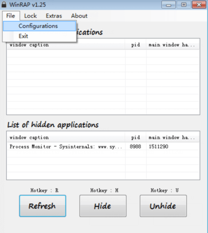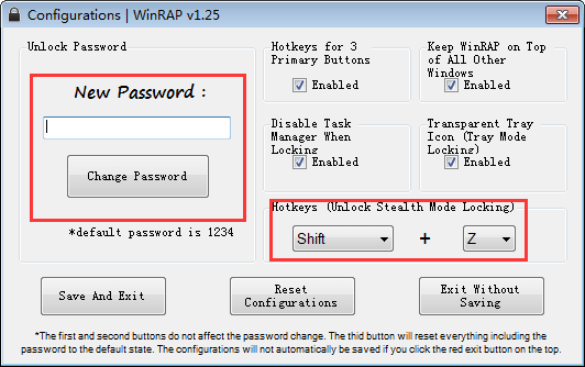 1. Go to “Configurations” in “File”. Create new password for WinRAP and click “Change Password” to save. After that, please set the hotkey to restore WinRAP.