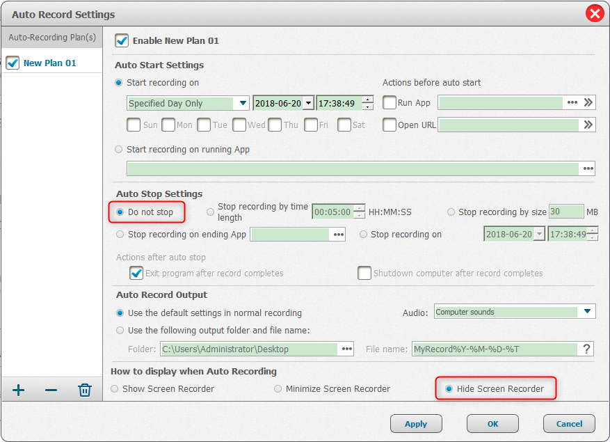 2. Check “Do not stop” item in Auto Stop Settings and the “Hide Screen Recorder” item in the right-bottom corner in the pop up window.
