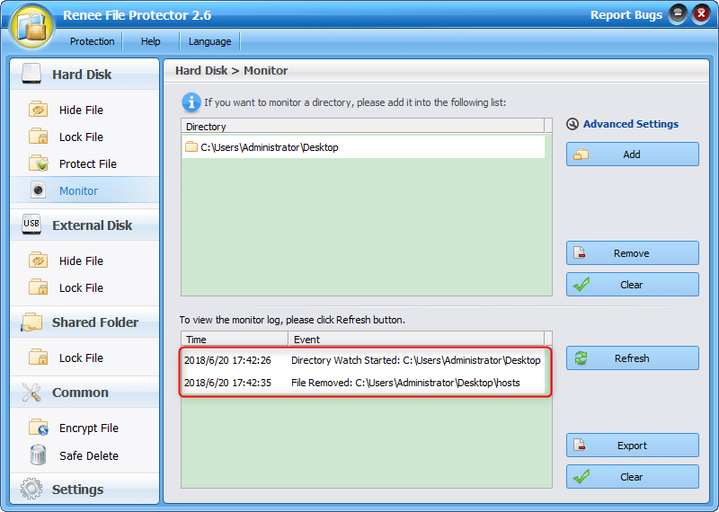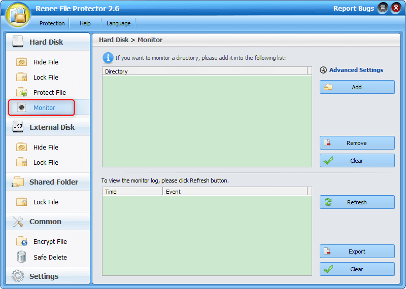Step 1: Launch Renee File Protector. Go to “Monitor” in “Hard Disk”.