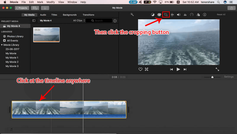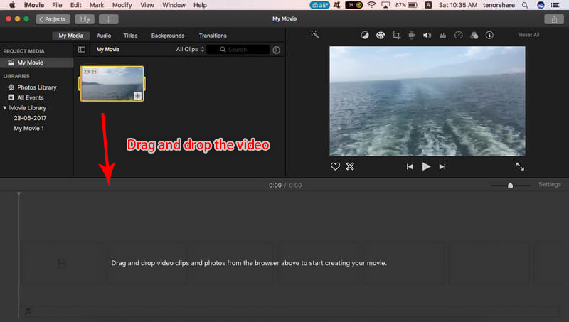 ① Open iMovie and add the target video file. Then drag the video to the timeline.