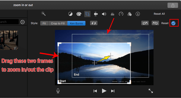 ④ Two frames, labeled Start and End, appear over the clip in the viewer. You can move them to adjust. To apply the change, click the button [√].