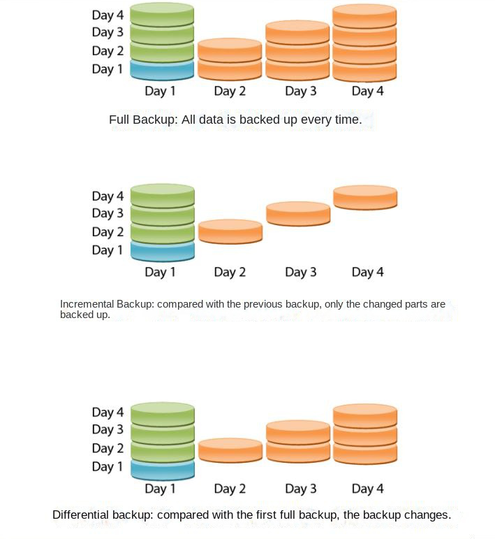 | differential backup | Each time, only the parts that are different from the first full backup are backed up, which takes up less space than the full backup, and the backup time is also shorter than the full backup. When restoring all data, you only need to restore the first full backup file and the last differential backup file, and the restoration time is shorter than incremental backup. | The backup time is longer than incremental backup, and it takes up more space than incremental backup. |