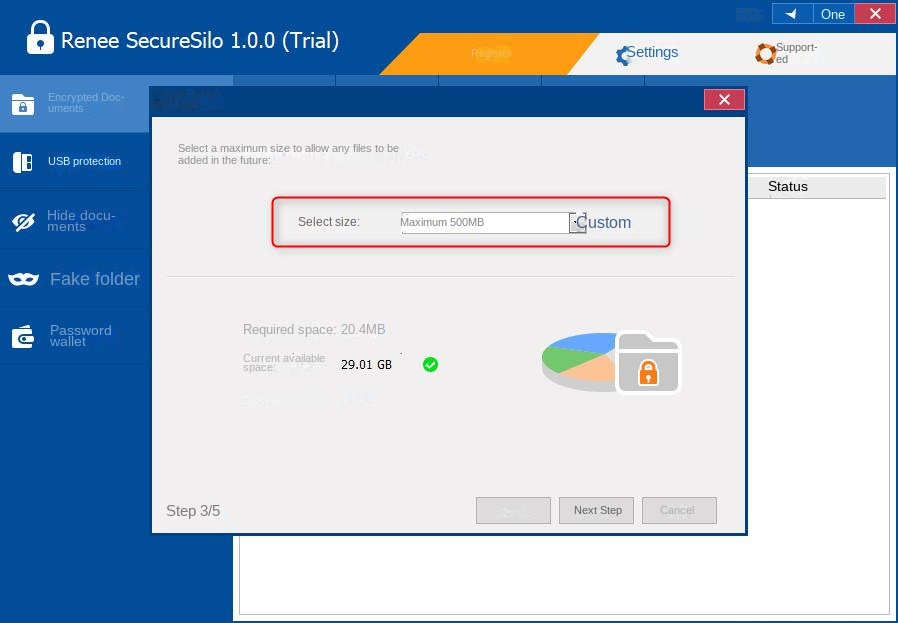 5. Select “Select Size”, set the capacity of the private disk, and click “Next”.
