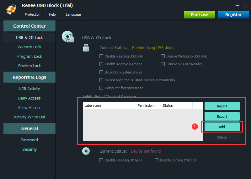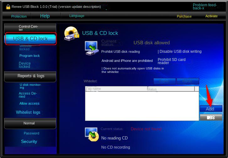 2. Insert the USB disk into the computer, under the column of USB & CD lock, click Add to add the USB disk you think is trustworthy to the white list.