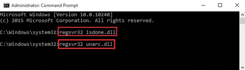 Step 2: Type regsvr32 isdone.dll command in the command prompt and press Enter. After registering the isdone.dll file, type regsvr32 unarc.dll and press Enter to re-register the unarc.dll file.