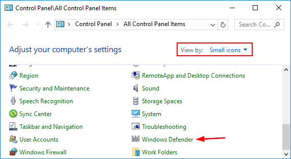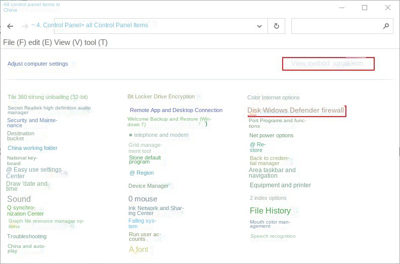 Step 1: Search for Control Panel in the taskbar search box in the lower left corner of the Windows desktop, open it, set the viewing method to Small icons, and then click Windows Defender.