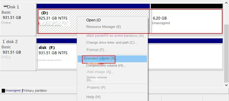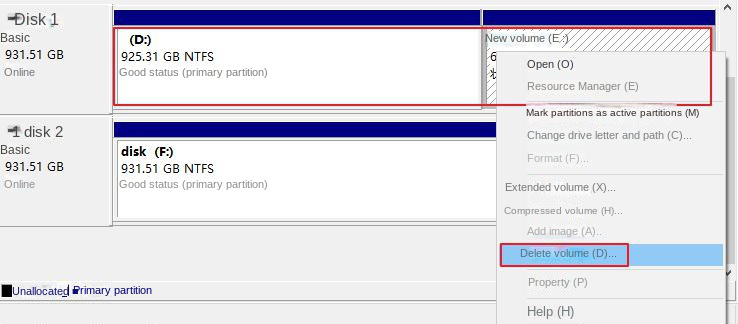 If there is no unallocated space behind the partition that needs to expand the size of the partition, but a partition, you need to delete that partition first to make it an unallocated space. Please right-click the target partition, select Delete Volume and follow the instructions.