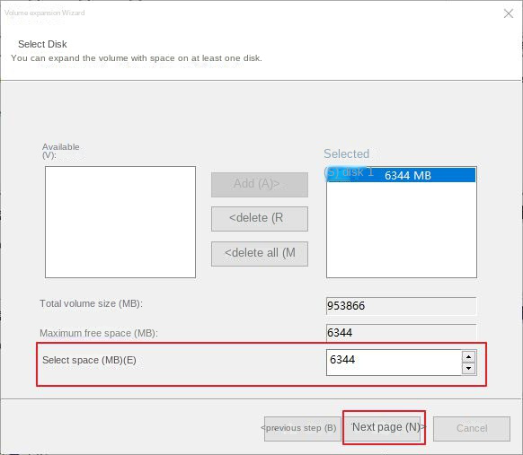 Step 3: Set the amount of space for expansion, which can be set to the maximum amount of available space. Then click Next > Finish.
