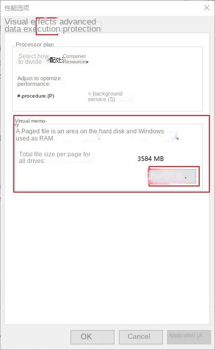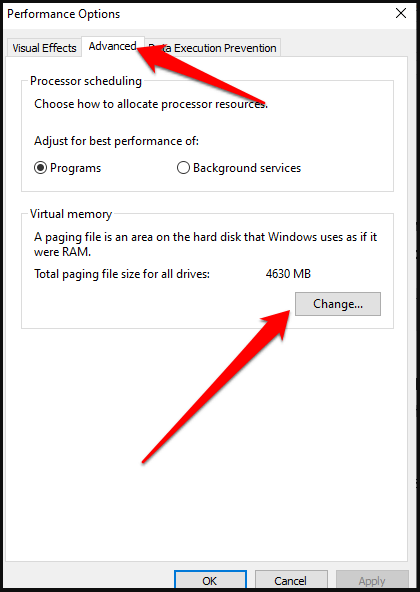 Step 3: In the Performance Options window, switch to the Advanced tab and click the Change button in the Virtual Memory column.
