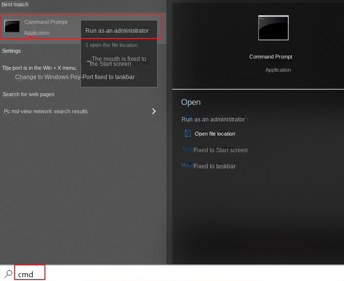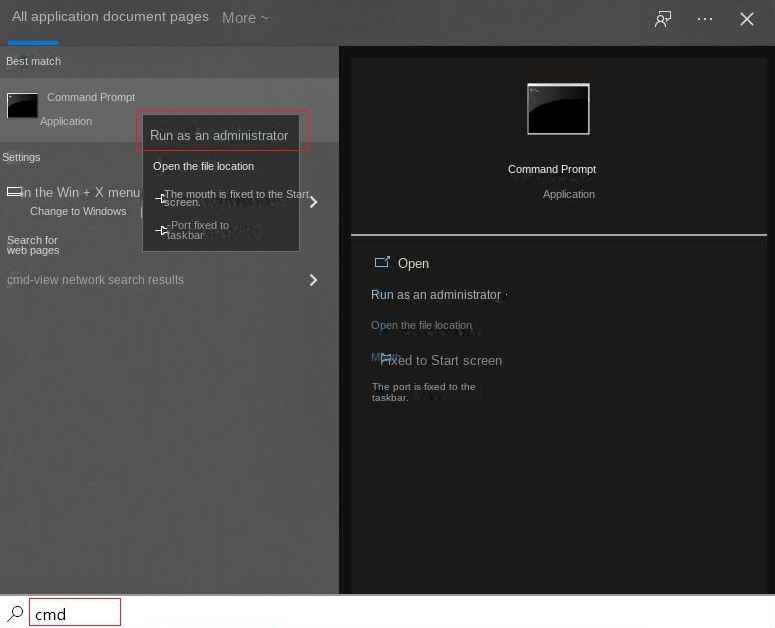 Step 1: Search cmd in the search box in the lower left corner. Right-click the search result, and select Run as administrator to open the command prompt tool.