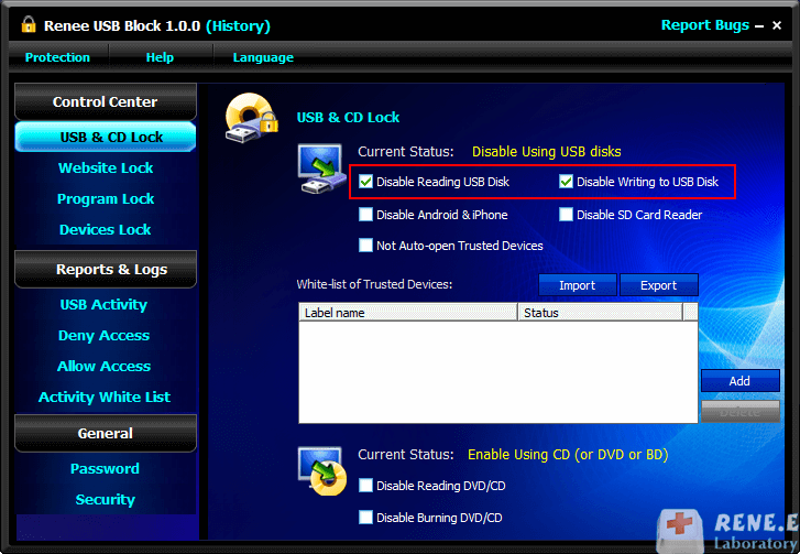 c. Under [Control Center], click on [USB&CD Lock] – [Disable Reading USB Disk] and [Disable Reading DVD/CD]. Then, the USB flash drive, CD and DVD cannot get access to our computer files. Besides, you can add the trusted devices to the white list for avoiding some search errors.