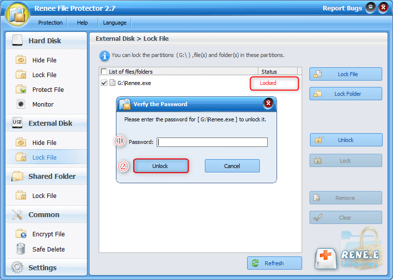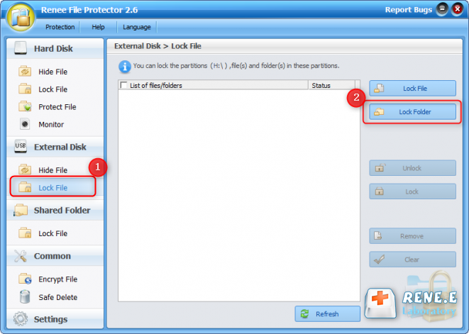 1. Go to Renee File Protector. Then select [Lock File] in [Hard Disk]. Click [Lock Folder] on the right pane and then select target folder in the pop up window. After that, files will be locked automatically.