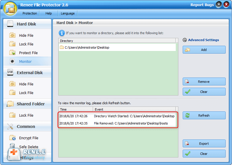 Renee File Protector, a software designed to protect data, can protect files/ hard disk from modification and unauthorized access. Besides, it can also protect the data security in external memory devices. Built-in monitor function can record the modified time of target files preciously.
