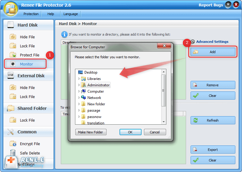 1. Find [Monitor] in [Hard Disk]. Then please click [Add] on the right side. Select target file/folder you want to monitor in the pop up window.