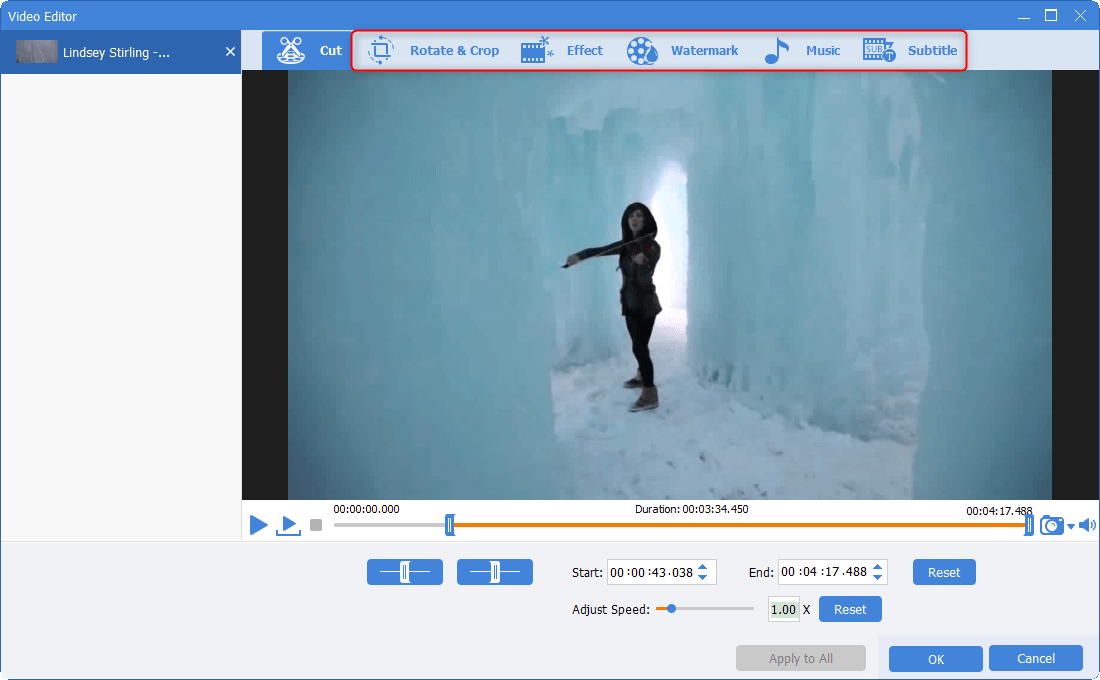 Step 8: After edit finish, please click “OK” to save the changes you have made. Then please select the target output file format, saving path and output settings accordingly. Click “Start” to output the video clip.