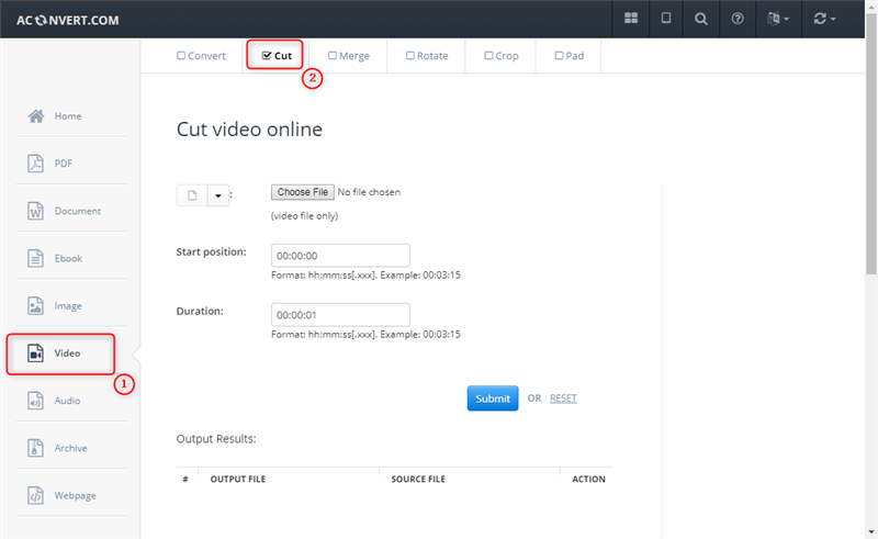 Step 1: Go to Aconvert and click “Video” on the left side and then select “Cut” function.