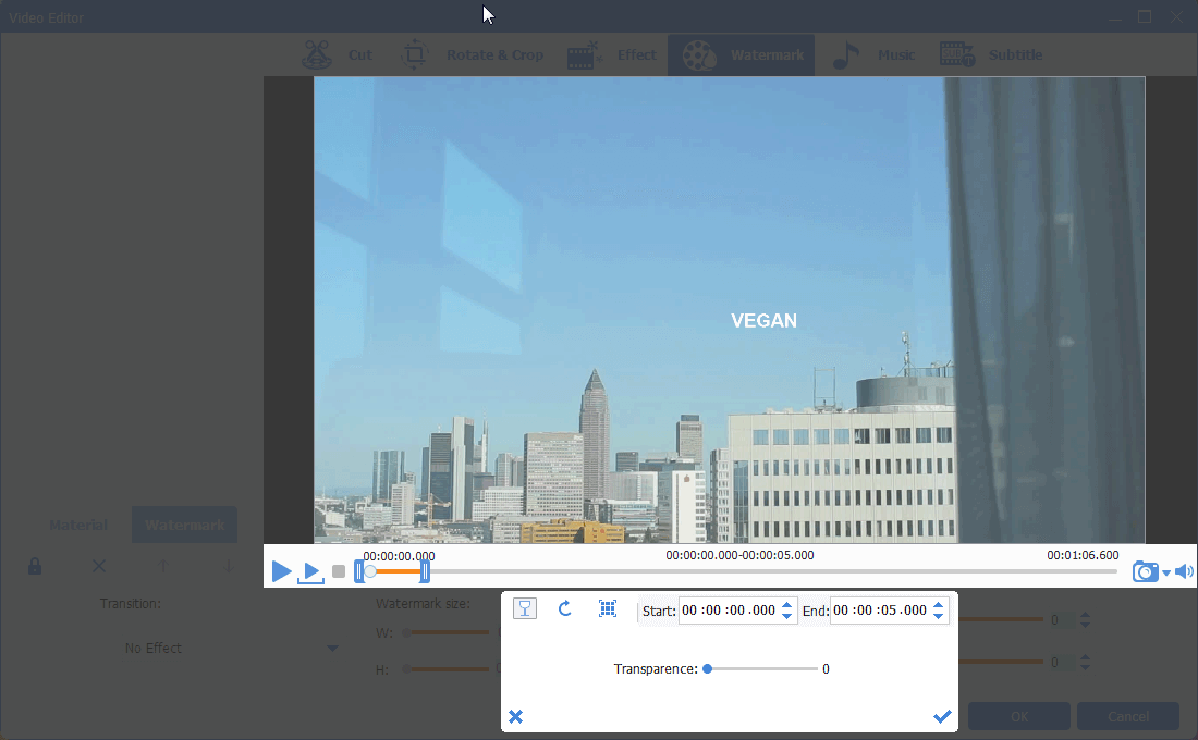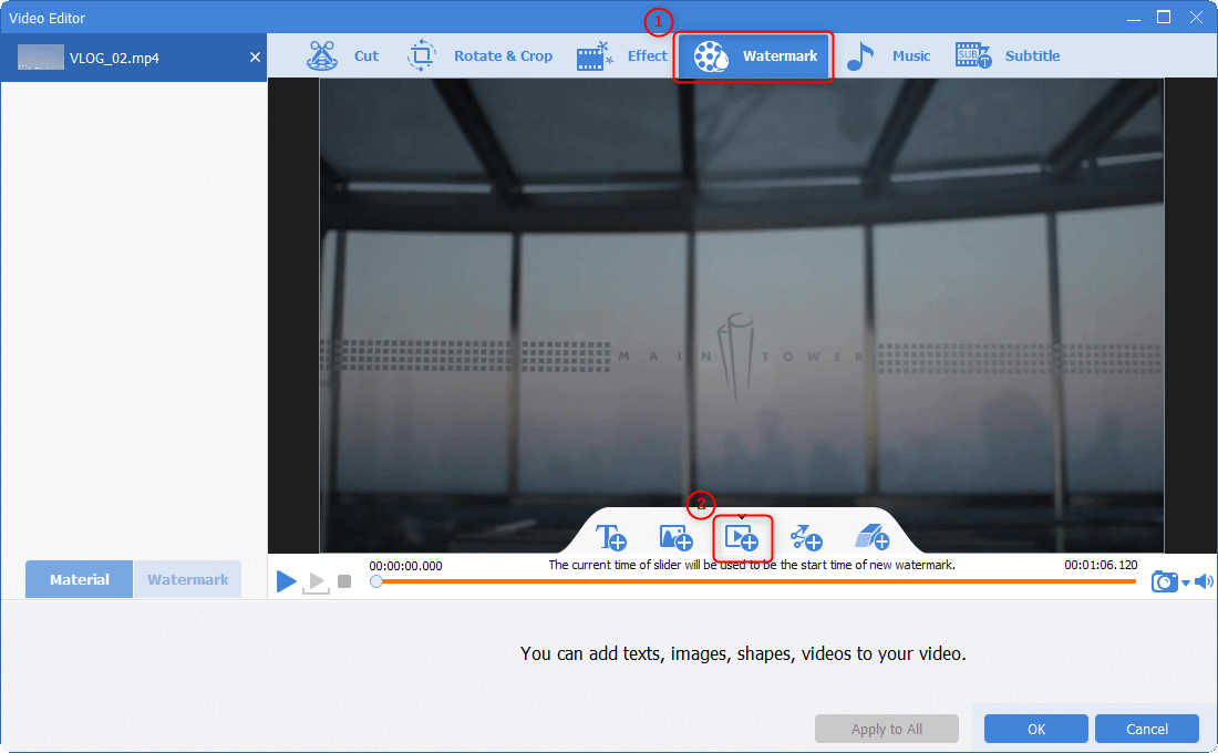 Step 1: Click “Watermark” function after selecting target Vlog video. In the pop up watermark edit window, you can choose to add texts, images, shapes and even videos.