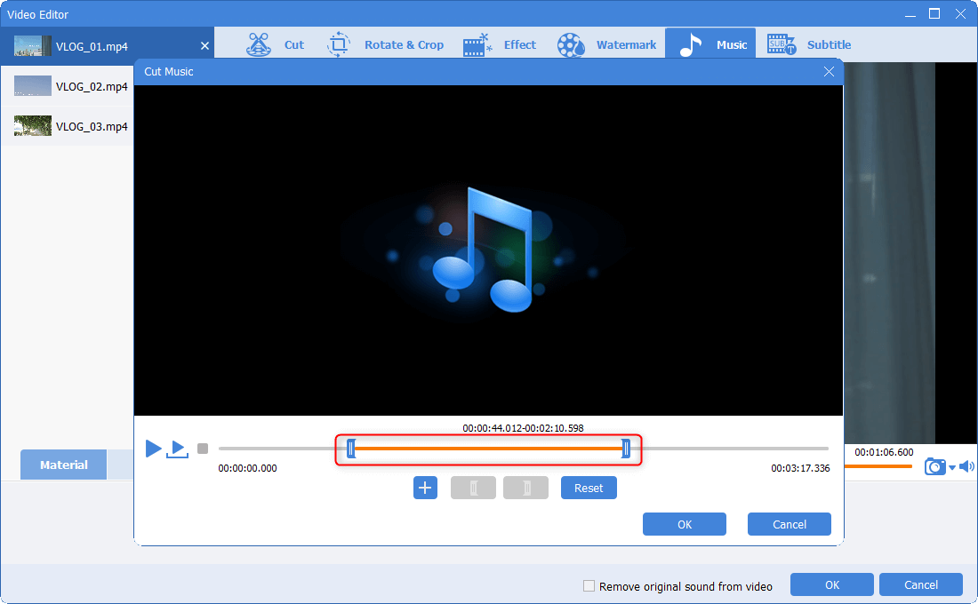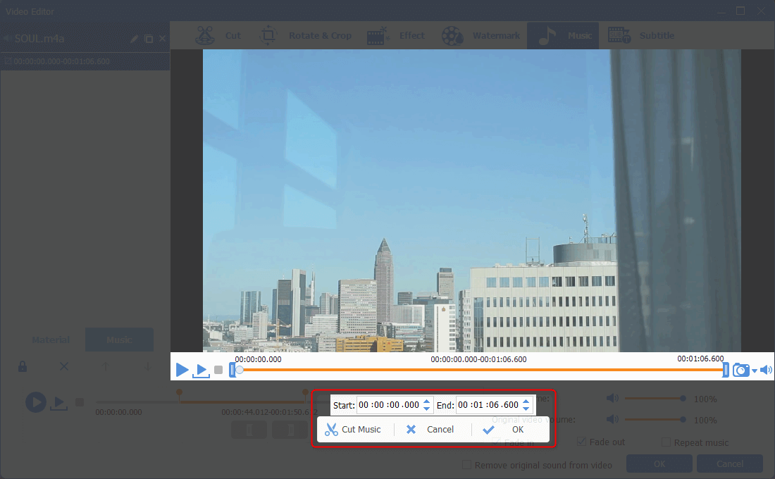 Step 2: Cut the music for desired clip and click “OK” to add the clip to video if necessary.