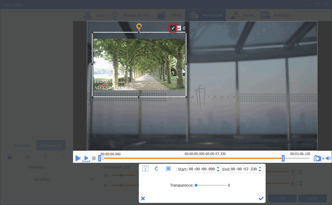 Step 2: We take Text watermark as an example. You can click “Edit” to choose desired font , font size, font color, text transparance, background color, transition, start time and duration.