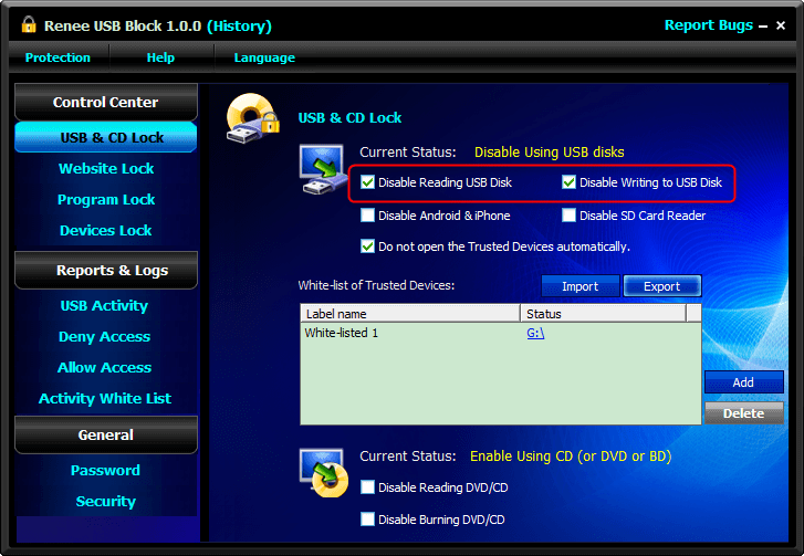 Renee USB Block can protect computer from attacks in USB-based external devices like USB disk, mobile phone and CD Rom. Besides, this software also provides functions like lock website and software. Provide better protection to data in computer.