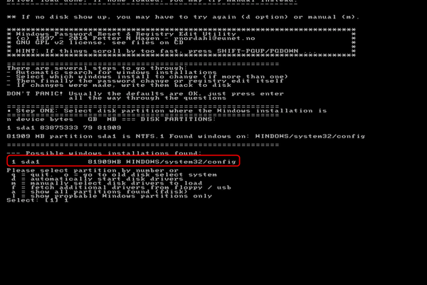 ④ Select the operating system after Offline NT Password & Registry Editor finishes loading. If there’re several systems, please type the number corresponding to the exact one and then press “Enter”.