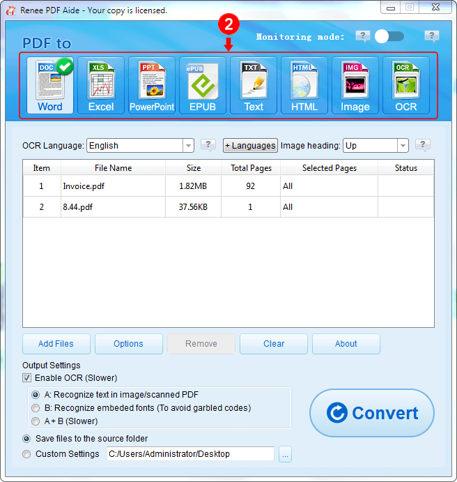 Improve the conversion accuracy by selecting the related language in OCR mode. Languages like English / French / Germany / Italian / Spanish / Portuguese / Chinese / Japanese / Russian are optional.