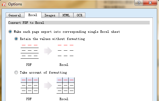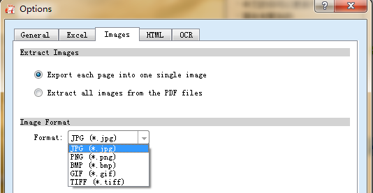 You should select a file format for the output files. Click the format you want above the pane: Word, Excel, Images, PowerPoint, HTML, and Text. If you select image as the output format, by default, the output format is jpg. Or you just click the Option button on Advance Settings button to select BMP(*.bmp), GIF(*.gif), PNG(*.png), TIFF(*.tiff) as the output format.