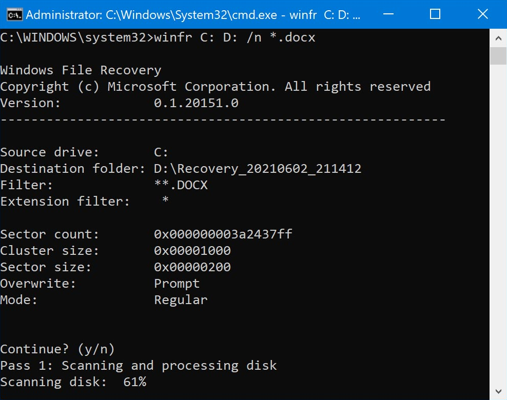 “*” can be replaced with a specific file path, which will speed up the scan: winfr C: D: /n \Users\Admin\Documents