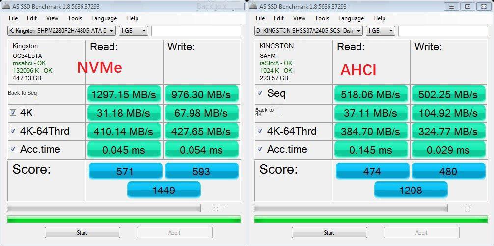AS SSD Benchmark to determine if the hard drive is NVMe or AHCI protocol. A comparison of two M.2 interface SSDs without protocols is shown in the picture: