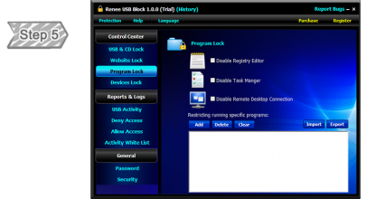 The best way is to block the related drives and devices which do not belongs to you. Renee USB Block provides a comprehensive solution for securing the data inside the computer. It can help you lock USB port, make DVD/CD burner read-only, block specified websites, forbid some programs and disable more devices.