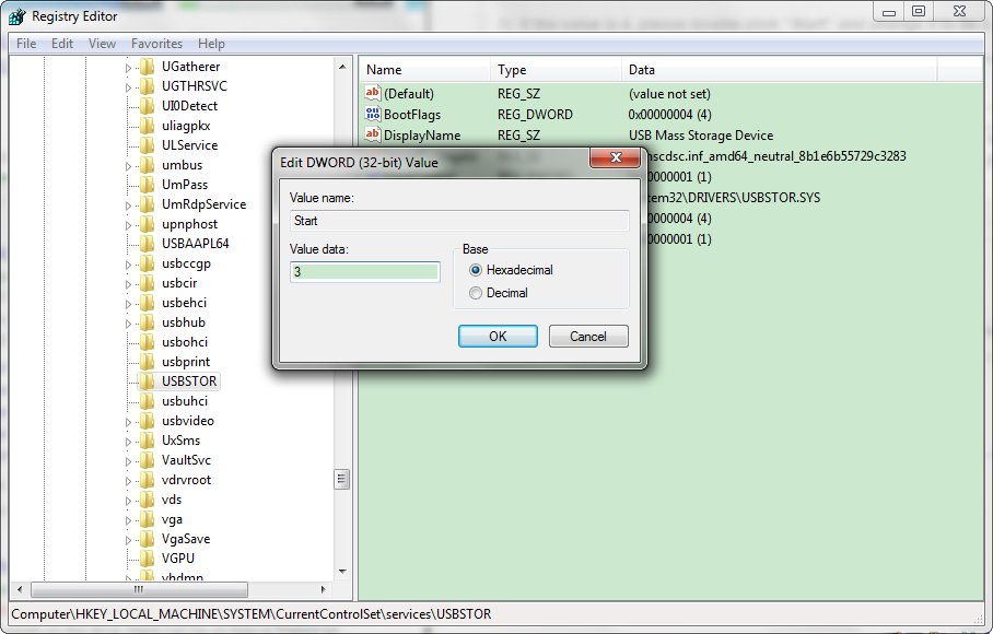 Step 2: Find USBSTOR item via the following path: HKEY_LOCAL_MACHINE\SYSTEM\CurrentControlSet\Services\USBSTOR Click “USBSTOR” and find the “Start” and check the value of “Start”. If it is 4, please double click “Start” and set it to be 3. After finishing all the steps above, please connect the USB device to computer again.