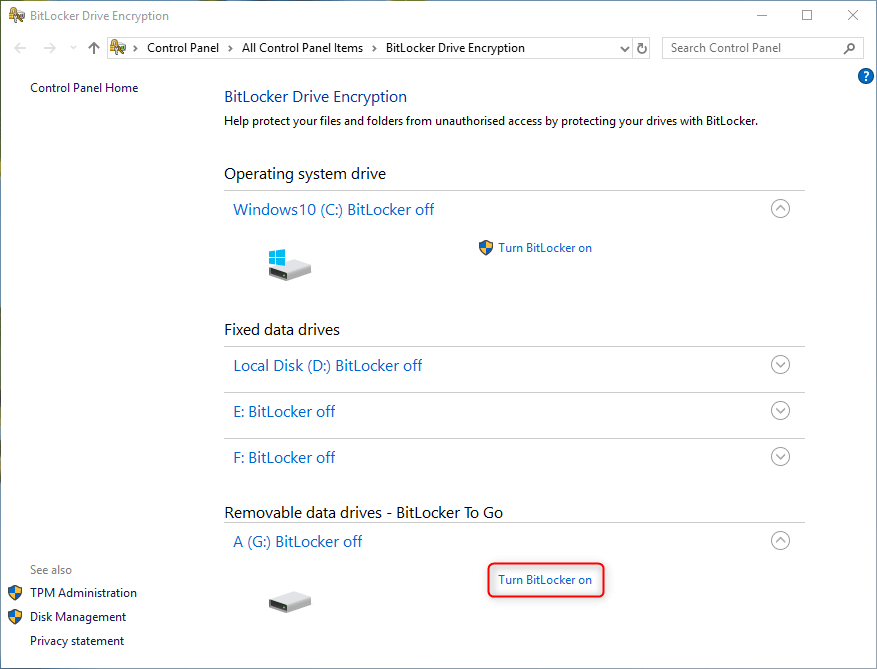 2. Find the target USB flash drive and click [Turn BitLocker on].