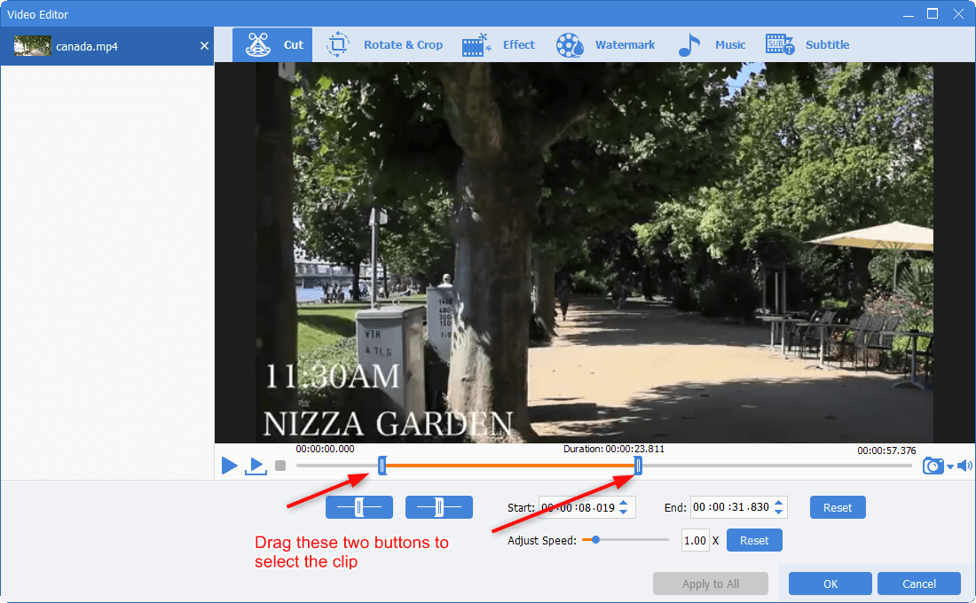 ③ Select [Cut]; then drag the progress bar to select desired part you want to cut from the video.