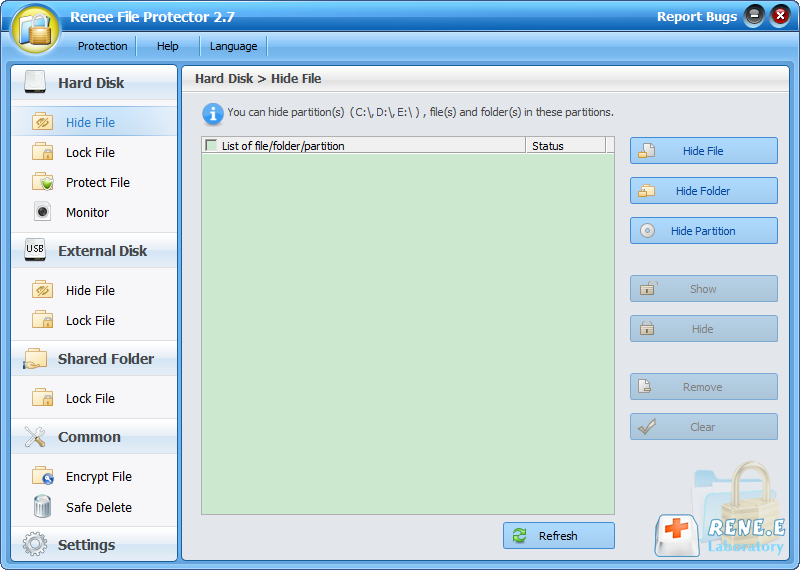 Good security – Compared with the hide function offered by Windows, Renee File Protector provides better security. All users must type the password to open Renee File Protector program before checking the hidden files.