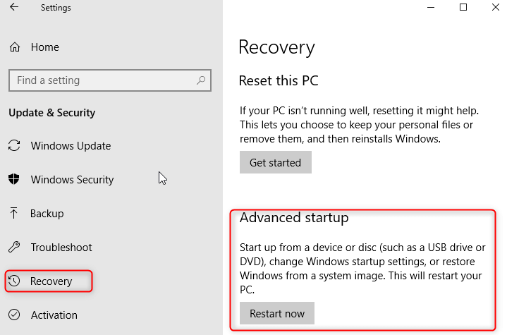 Click “Update & Security” and click “Recovery”. Finally click “Restart now” under “Advanced startup”.