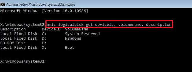 Please type in: wmic logicaldisk get deviceid, volumename, description, press “Enter”.