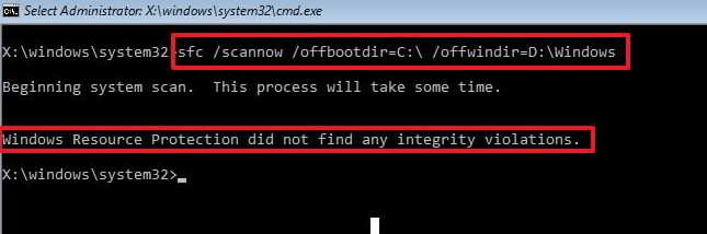 Please type in: sfc /scannow /offbootdir=C:\ /offwindir=D:\Windows. Press “Enter”.