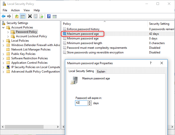 This security setting determines the period of time (in days) that a password can be used before the system requires the user to change it. For example, if you set 90 days, your password will expire in 90 days then system will require you to change it. But the password will not expire if the maximum password age is set to 0.