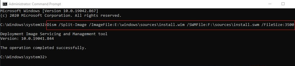 (Dism /Split-Image /ImageFile:E:\windows\sources\install.wim /SWMFile:F:\sources\install.swm /FileSize: 3500). Then press (Enter) and wait for the command to complete.