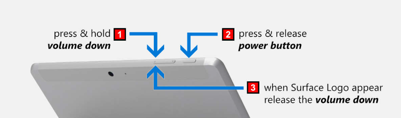 c. Keep holding the Volume Down button until the Surface logo appears on the screen. Then, release the Volume Down button.