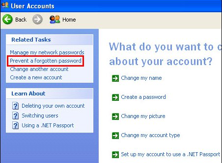 When the User Accounts control panel opens, select a user name and then click on the Prevent a forgotten password option under the Related Tasks box.