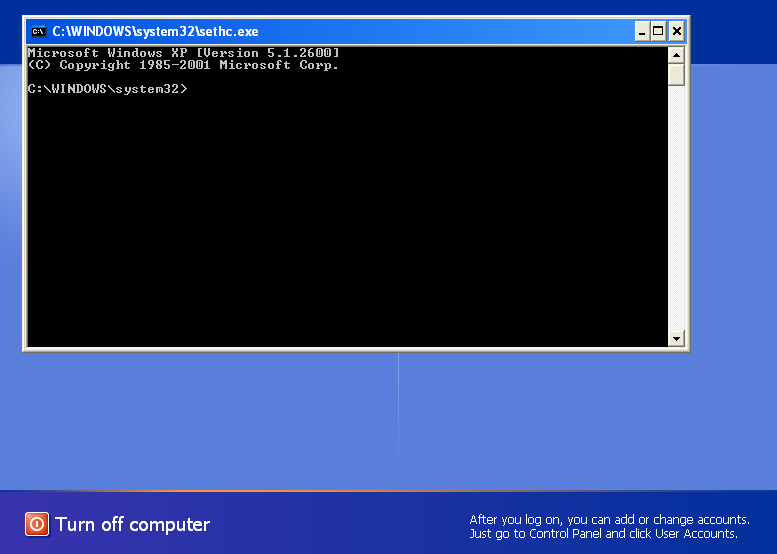 9. When the Windows XP login screen appears, press LeftAlt+LeftShift+PrintScreen key combination to run SETHC.EXE = CMD.EXE. If it doesn’t work, here are other alternatives: